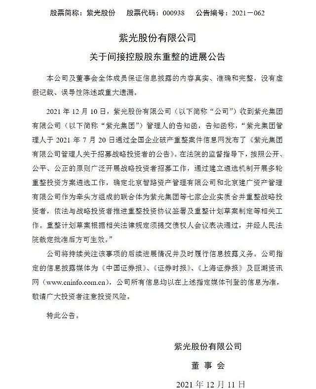 阿里和智路建广联合体一路明争暗斗,直到12月10日,紫光集团发布公告,才最终宣布尘埃落定,呼声较高的阿里成了"陪跑者"。
