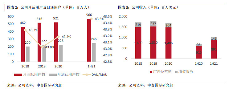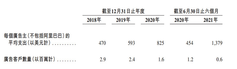 2018年广告客户数量290万是近四年最高,2019年和2020年广告客户数分别是240万和160万。截至2021年上半年广告客户数为60万,相较去年同期的120万再次锐减到一半的地步。