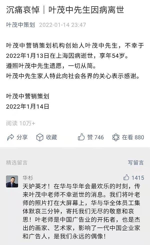 被称为"营销策划行业宗师级人物"的叶茂中去世了。
