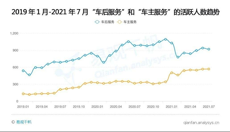 数据显示,以"途虎养车"为代表的"车后服务"在2021年7总体月活跃人数为919.13万人,"日产智联"等汽车厂商所在的"车主服务"同月活跃人数在568.24万人,两者量级相差近一倍。
