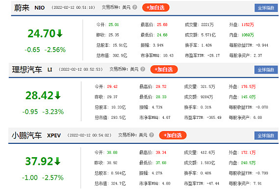 资本市场现在也表达了对蔚来、理想和小鹏的信任,和FF股价不断下跌不同。截至2月12日,蔚来股价24.69美元,总市值392.9亿美元;理想股价为28.42美元,总市值为293.5亿美元;小鹏股价为37.92美元,总市值为324.7亿美元。