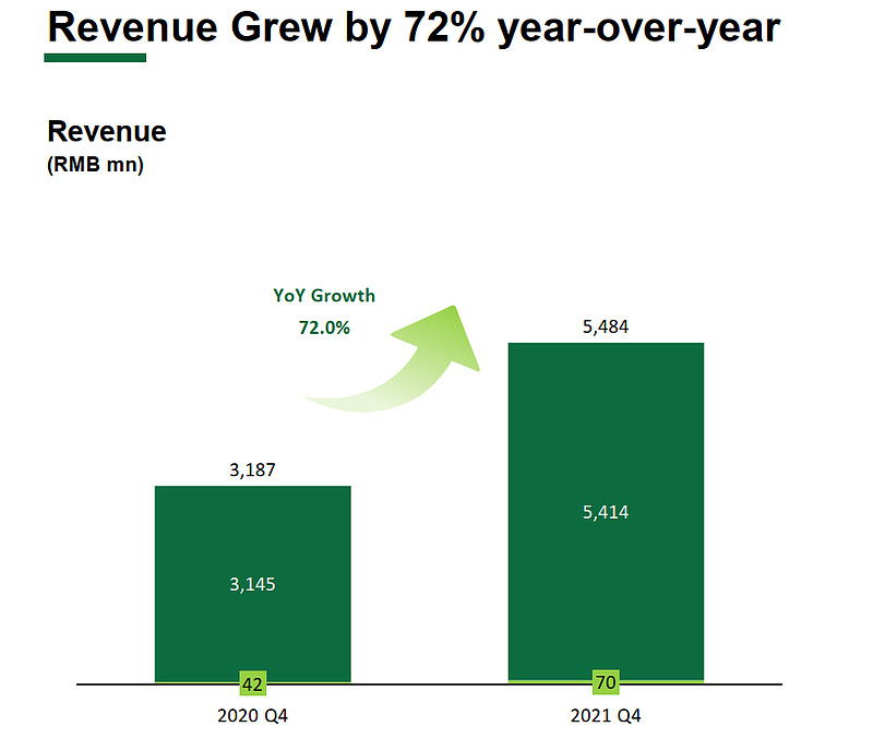 该季度总营收为54.84亿元,同比增长72%,亏损10.34亿元,同比收窄17%,而环比第三季度20.1 亿元的巨额亏损,环比收窄了接近50%。截至2021年12月31日,叮咚买菜2021年总营收为201.2亿元,同比增长77.5%。