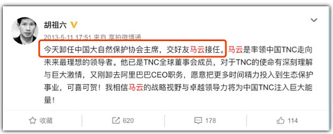 BT财经仔细梳理胡祖六和马云的关系发现,在胡祖六把大自然保护协会中国主席让给马云之前,两人并无太多交集,两人关系升温是在此之后,不仅仅是蚂蚁森林的创立和春华资本入股蚂蚁金服,后期两人关系直接上升到战略合作伙伴的关系。