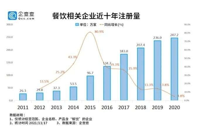 按照企查查统计的数据,餐饮相关企业的注册量近十年来连年走高。2020年全年下来能与餐饮搭上关系的企业共注册了247.2家,而在2021年前十个月,这个数据刷新到了384.1万家,同比增长率达到95.4%。