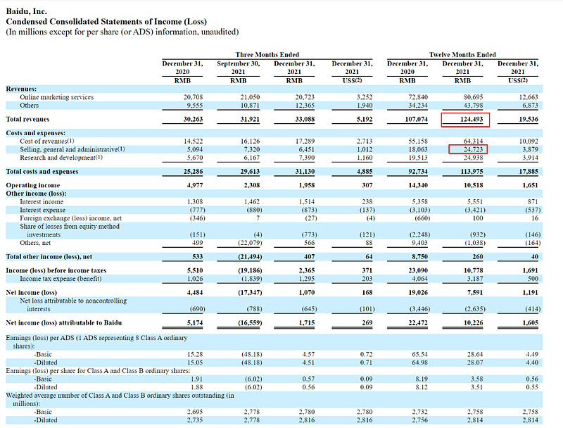 再比如3月1日发布财报的百度,2021年总收入大概在1245亿左右,其销售和一般行政开支总计247亿左右,占比不到25%,而且其中大部分还是营销费用支出,真正到行政开支的恐怕占比不会比阿里多多少。