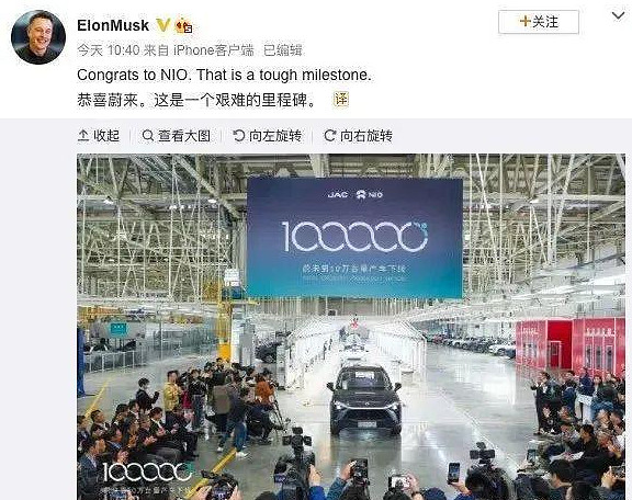 2021年4月7日,蔚来第10万台量产车在合肥基地下线,从2018年5月第一台车才正式投产,到10万辆,蔚来用时不到2年,是一个了不起的成就。特斯拉创始人埃隆马斯克也在第一时间在社交媒体发来了对蔚来的祝贺,称"这是一个艰难的里程碑"。