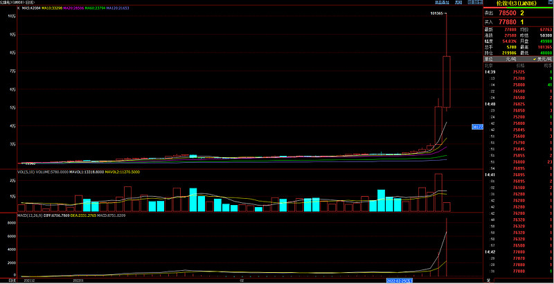 在LME的隔夜盘中,镍日内最大拉涨89%,最高达55000美元/吨。到凌晨收盘,LME市场上镍价收涨76%,至50905美元/吨,为2007年6月以来最高水平。如果说此时镍价还有来有往属于震荡上行的阶段,等到白天亚洲交易行情开启,镍价的疯狂迅速让很多人目瞪口呆。