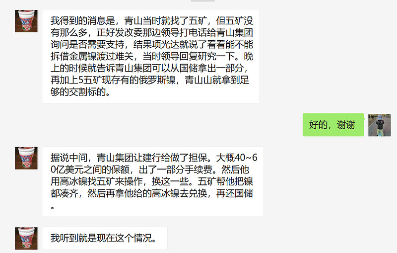 最终消息也证明了这一点,只不过出手的很可能是国储和五矿集团。根据业内资深人士张先生接受BT财经问询回复信息显示,据说青山集团紧急找到能从俄罗斯搞来镍矿的中国五矿集团,但五矿短期内拿不出这么多,库存有限。