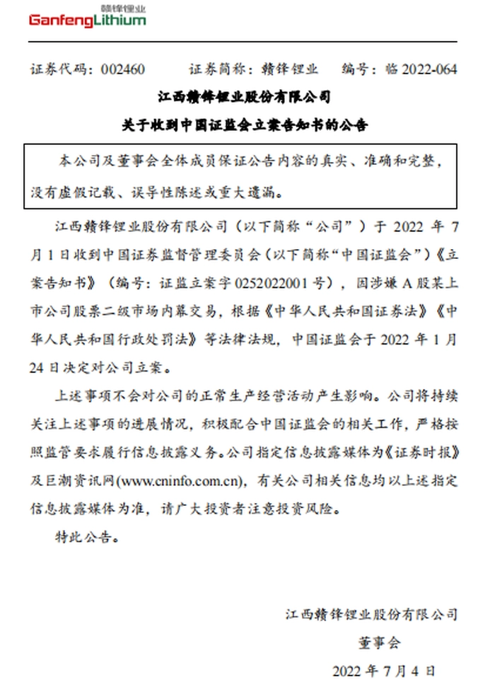 7月4日,国内锂能源行业巨头赣锋锂业(SZ002460)发布公告称,公司于2022年7月1日收到中国证监会《立案告知书》,因涉嫌A股某上市公司股票二级市场内幕交易,证监会决定对公司立案。