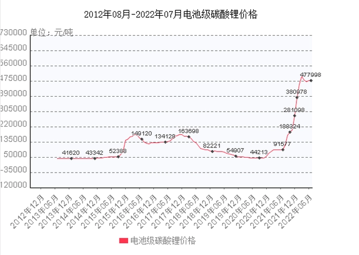 新能源市场的火爆直接带动的上游原材料碳酸锂的价格疯涨,截至2022年07月,电池级碳酸锂价格为477998元/吨,同比增长率为421.96%,而在10年前,电池级碳酸锂的价格尚不到如今的十分之一,仅为41620元/吨。