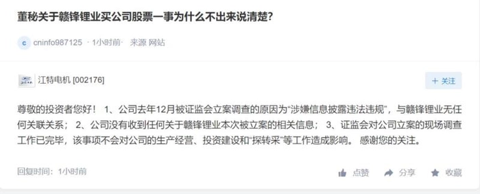 江特电机第一时间在7月4日回应投资者疑问,称江特电机去年12月被证监会立案调查的原因为涉嫌信息披露违法违规,但具体披露给谁,江特电机并未明说,不过强调了与赣锋锂业无关,还着重说明了江特电机和其无任何关联关系。回应还声称没有收到任何关于赣锋锂业本次被立案的相关信息,一下将赣锋锂业和其关联关系摘得清清楚楚。