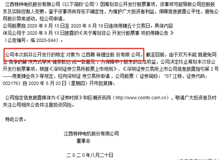 赣锋锂业就是在江特电机被证监会立案调查期间被传出将入主江特电机的消息。直到8月20日,江特电机发布公告才证实赣锋锂业一度要入主的消息。