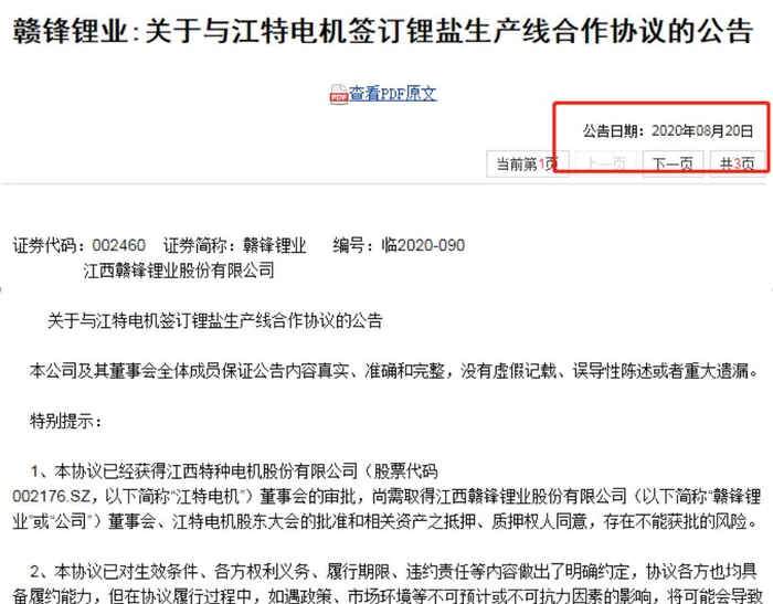 但据BT财经查阅赣锋锂业所有的公告中,2020年7月并没有有关江特电机的并购协议,直到2020年8月20日,才出现所谓的公告。