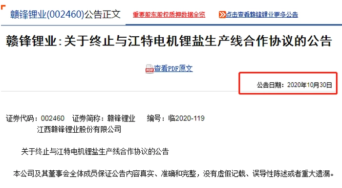 据赣锋锂业此前公告显示,赣锋锂业与江特电机的合作计划为时长30个月,开始时间为2020年10月1日,结束时间至2023年3月31日,在此期间赣锋锂业需要向合计向江特电机支付合作管理费1.92亿元。但合作不到一月,双方就产生分歧,从赣锋锂业10月30日发布公告可以看出,双方未能就锂盐生产线技术改造方案达成一致意见,合作至此结束。