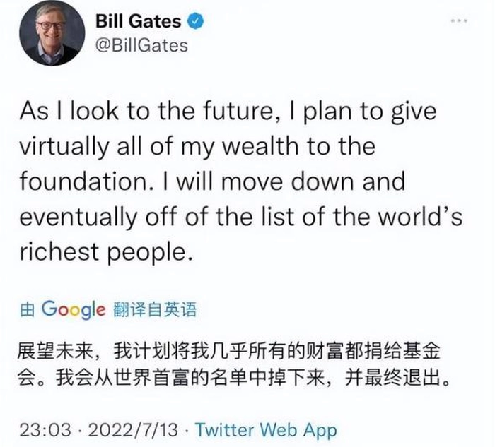 盖茨表示:“展望未来,我计划将自己的全部财富捐给基金会,除了我花在自己和家人身上的钱之外……我计划将我几乎所有的财产转给基金会。最终,我将从全球最富有的人名单上消失。捐钱对我而言不是牺牲,我很荣幸能够参与应对这些巨大挑战。”
