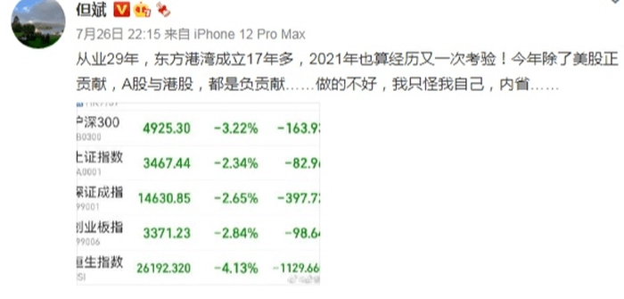 “坚持长期主义”的但斌想以身证道,结果2021年收益持续暴跌,不堪重负的但斌再次道歉,同时发文表示:除了美股正收益以外,A股、港股的投资目前都是负收益,做的不好只怪自己。这等于间接否定了自己信仰的长期主义投资理论。