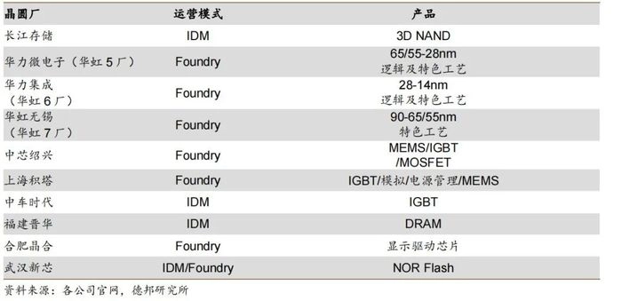 现在,国内出现以中芯国际、长江存储、华力集成、华力微电子、福建晋华、华虹无锡、合肥晶合、上海积塔、中车时代、武汉新芯 等主要的 IDM 或代工企业。这些企业分别覆盖存储、逻辑、驱动 IC、SOC、功率、模拟等多类芯片制造。