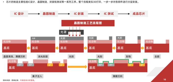 实际上,由于半导体设备应用的工艺流程和重要性的不同,芯片生产原材料方面的进展跟设备的进展是分开的。从真正涉及到设备生产的领域来看,芯片主要分为光刻、刻蚀、沉积、清洗等涉及核心工艺的关键设备。行业内将关键半导体设备区分为制程核心设备(包含光刻、刻蚀、沉积、离子注入设备)、良率提升设备(包括前道检测设备、后道测试设备、清洗设备)以及重要辅助设备(包括炉管设备、CMP 抛光设备、干法去胶设备、涂胶显影设备)等等。