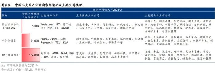 一个是第三代半导体。依照调查公司Yole和华泰证券的测算,到2025年全球碳化硅(SiC)和氮化镓(GaN)市场规模有望分别达60亿与35亿美元。这就是所谓的第三代半导体,可满足高温、高压、高频等应用场景,与新能源汽车、光伏、5G、消费快充等高成长性下游领域深度绑定,未来成长空间广阔。