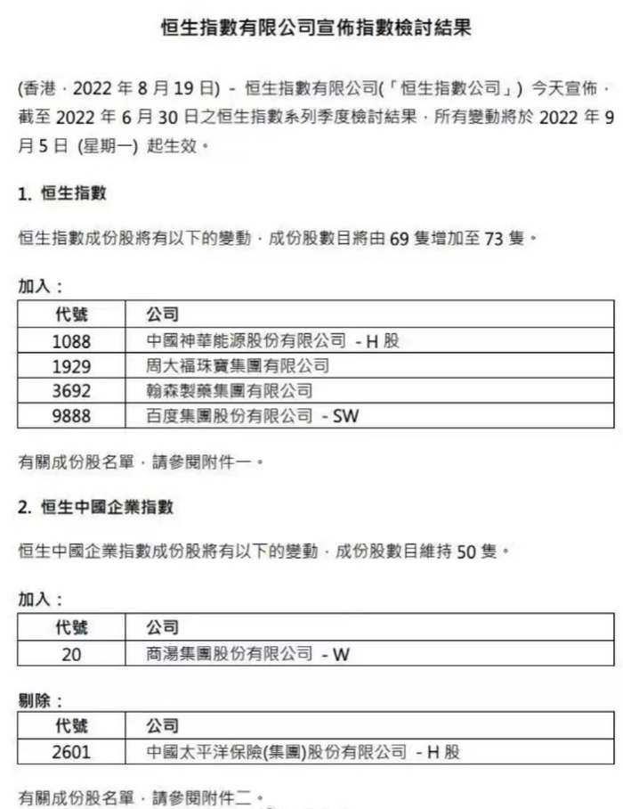 数据显示,2021年第一季度到2022年第二季度这个五个季度恒生指数总计纳入19只成分股,期间季度纳入分别为(按时间顺序)3只、2只、4只、2只、4只和这一次纳入百度等4只,恒生指数一共仅纳入了73只成分股。