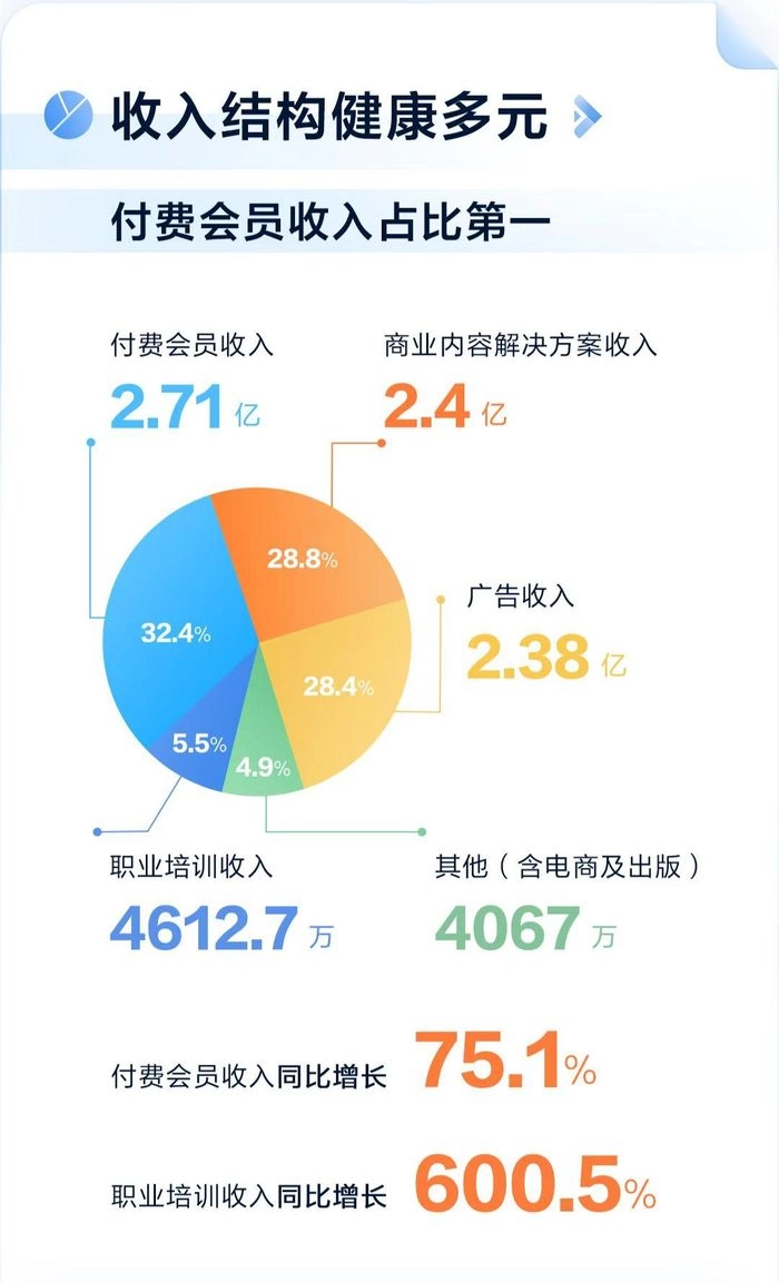 商业化层面,知乎第二季度营收达到8.36亿元,同比增长31%,毛利率达47.8%,继续保持在行业高端。知乎的收入结构也更加健康多元,表现为付费会员、职业教育为代表的C端收入持续高速增长。付费会员收入创下2.71亿元新高,同比增长75.1%,在总收入中的占比首次升至第一位。职业教育收入依然保持超高增速,收入达到4612.7万元,同比增长600.5%,正在成为新的增长动力。电商、出版等其他收入达到4067万元,同比增长91.9%。