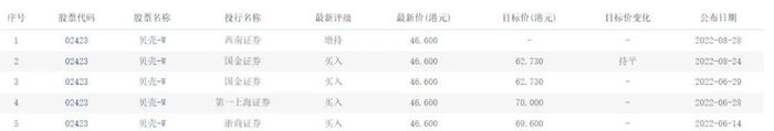 2022年6月至8月,国金证券、第一上海证券、浙商证券对贝壳-W(02423)给予“买入”评级,半年报公布后,西南证券对贝壳-W(02423)给予“增持”评级。