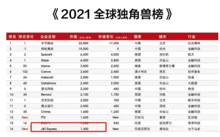 根据极兔官网显示,极兔目前已经在全球拥有超过240个大型转运中心、600组智能分拣设备、8000辆自有车辆,同时还运营超过23000个网点,10000+网络合作伙伴,服务人员数量近35万人。在2021年胡润研究院全球独角兽榜单中,极兔快递以1300亿的估值成为全球唯二超过1000亿的物流公司,另外一家是依托阿里的菜鸟物流。
