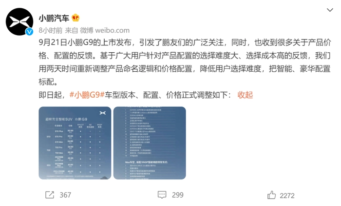 市场反应如此激昂,以至于发布会差点沦为一场“公关危机”。小鹏汽车不得不连夜修改SKU,9月23日发布调整公告。