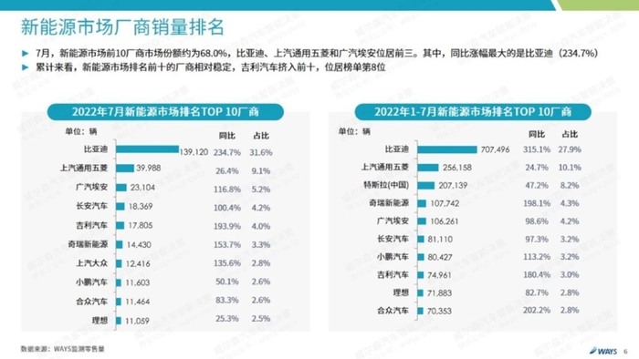 而据乘联会数据,对于造车新势力而言,躬身入局新能源的传统车企是碾压式的存在。今年7月,比亚迪销量达13.9万辆,同比增幅234.7%,市场占比31.6%,因手握电池等核心技术,市场表现一骑绝尘;上汽、广汽、长安、吉利、奇瑞等传统车企修炼的“小号”也都牢牢占据了TOP 10榜单前列。