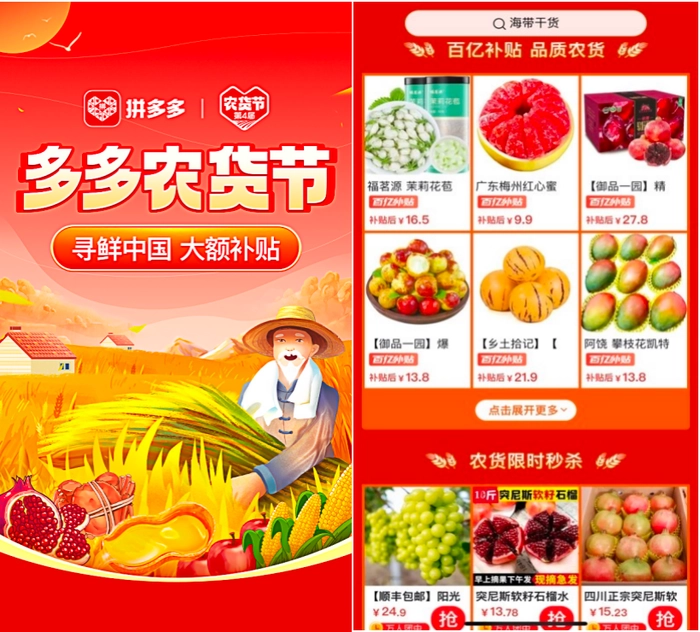 拼多多2015年创办时即入局农业,以生鲜农产品“零佣金”打底,“百亿补贴”重投入,改变了整个电商江湖,创造了电商行业的补贴新纪录,涉农的生鲜电商不仅由“双雄会”正式变成了“三国杀”,且拼多多后来者居上,成为全国最大农产品电商平台。