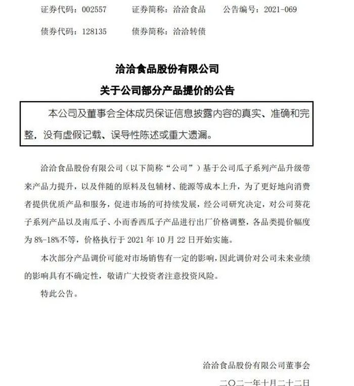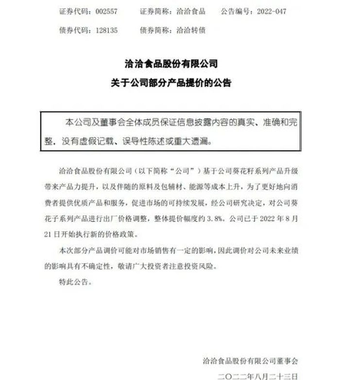 2022年8月24日,洽洽食品发布提价公告称,基于公司葵花籽系列产品升级带来产品力提升,以及伴随的原料及包辅材、能源等成本上升,为了更好地向消费者提供优质产品和服务,促进市场的可持续发展,经公司研究决定,对公司葵花籽系列产品进行出厂价格调整,整体提价幅度约3.8%。公司已于2022年8月21日开始执行新的价格政策。