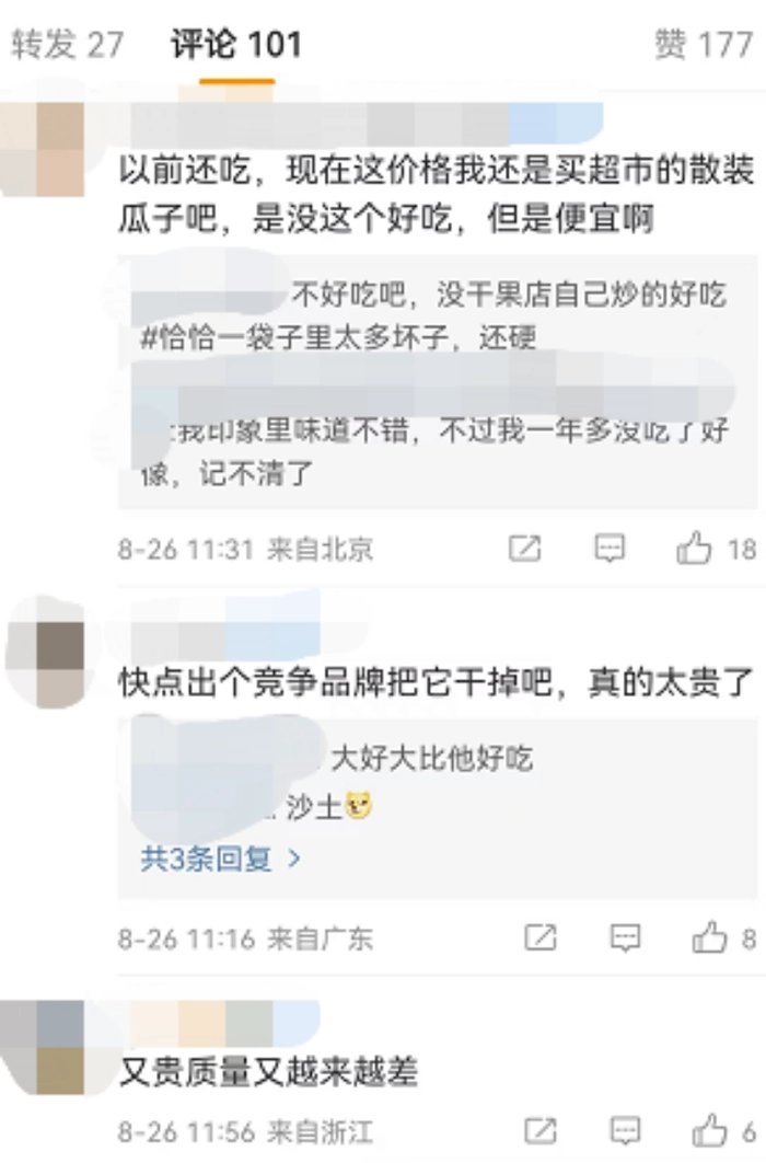 但不少网友并不买账,表示“瓜子自由没了。”;“洽洽涨价还不如去买散装,便宜又好吃。”;“涨价就不吃了。”可见此番提价也会影响洽洽在消费者心中的形象,甚至甚至影响销量。