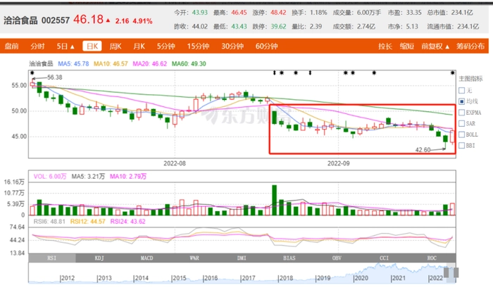 但这份看似“优异“的成绩单却未能打动投资人的心,在财报发布当日(8月19日),洽洽食品股价迅速走低,盘中一度触及跌停,发布财报当日洽洽食品收盘价为47.5元,跌幅达9.7%。而后,洽洽食品股价波动下跌,即使9月26日小幅回调,当日股价上涨4.91%,也仍未能扭转下跌态势,相对财报发布前,洽洽食品股价已经下跌13.9%。