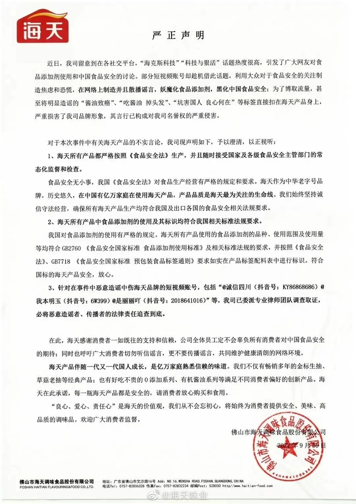 近期,“海克斯科技食品”、“科技与狠活”成为了热点话题,海天酱油成为众矢之的,被众多短视频账号曝光是“海克斯科技食品”,引发广大网友的激烈讨论,一片声讨之声在网上兴起。