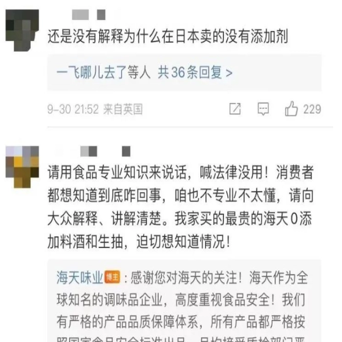 让消费者无法忍受的倒不是有没有添加剂的问题,而是他们对国内消费者和海外消费者的“双标”。有去过日本的网友直接在官微下面留言,质问海天酱油,为什么卖往日本的酱油没有添加剂?对这个问题,海天味业是选择性“无视”,回复了下面的问题,却直接忽略了上面那个关于海天味业对中国消费者和日本消费者的“双标”问题。就这样越是避重就轻,越是选择性逃避,更加重了网友对其的“双标”质疑。