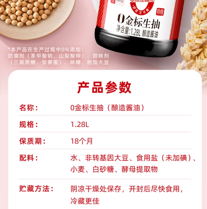 BT财经注意到,海天味业确实在国内推出了0添加系列、有机酱油系列等产品,在京东商城上,海天0金标生抽酱油,1.28L*2瓶组合售价为29.9元,价格高于普通酱油。