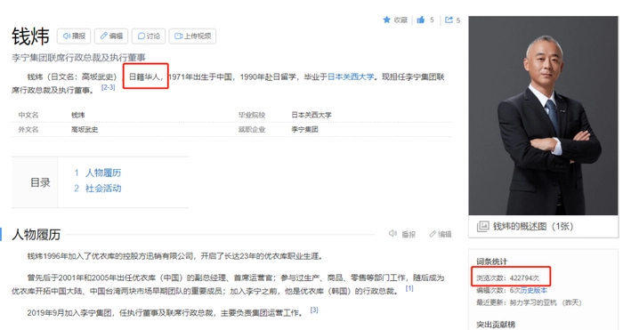 在李宁2022年秋冬新款发布会翻车后,李宁公司的高管被众多媒体起底,让消费者大跌眼镜的是,目前,李宁公司的联席行政总裁竟然是个日本人。这位原名为钱炜的职业经理人原本是陕西人,留学日本关西学院后选择了加入日本国籍,并将名字改为高坂武史。