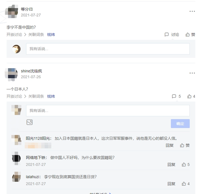 在百度百科上钱炜同样成了热搜的名人,一个公司的高管能有如此高的浏览量,李宁这次新品发布会翻车事件功不可没,在钱炜的词条讨论中争议最大的是:李宁到底算是国货还是日货?李宁倾注心血打造的国货品牌形象,可以说在一夜间彻底崩塌。