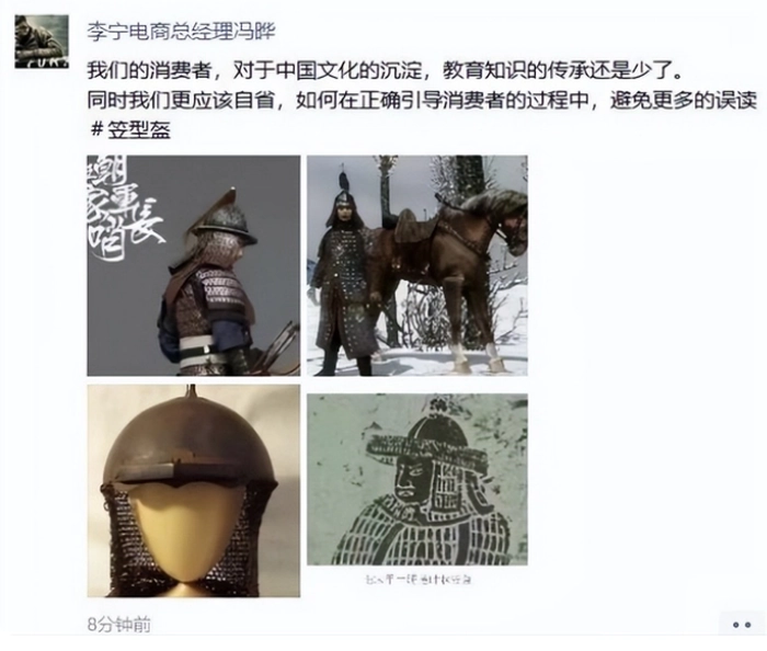 在李宁电商总经理冯晔眼中,中国消费者没有传统文化的积累,所以无法看出李宁服饰中的元素来自中国古代的“笠型盔”。