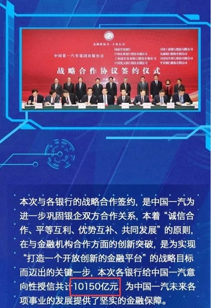 值得一提的是,在红旗这次品牌复兴的背后,一汽集团获得了8家银行的鼎力支持,意向性授信金额高达10150亿元,相当于A股汽车整体上市总市值的1.5倍。