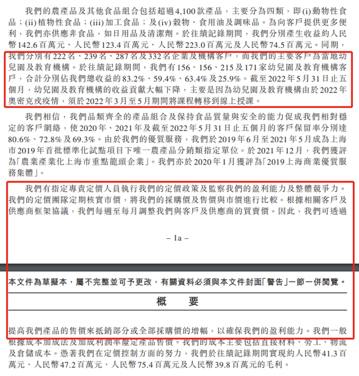 招股书显示,乓乓响的农产品及其他食品组合包括超过4100款产品,主要分为动物性食品、植物性食品、加工食品等,其主要客户群体为幼儿园及教育机构,其中近年来合作幼儿园数量分别为2018年的156家、2019年的156家、2020年的215家/2021年的153家以及2022年前五个月的171家,截至2021年,乓乓响拥有包括215家幼儿园在内的287家企业及机构客户。