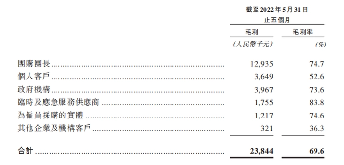 在已经公布的2022年前5个月的数据中,“团长们”给乓乓响带来了一半以上的营收,达到1732.3万元。其中来自临时及应急服务客户的毛利率达到了69.6%,在其各客户群体中毛利率最高,团购团长毛利率74.7%、政府机构毛利率74%、毛利率为52.6%,