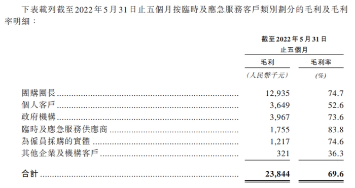 正是乓乓响成为上海的保供单位,自此他们的毛利率就火箭般高升,招股书中显示,来自临时及应急服务客户的收益却突然占到了乓乓响前五个月的约46.0%,为收益的最大份额。
