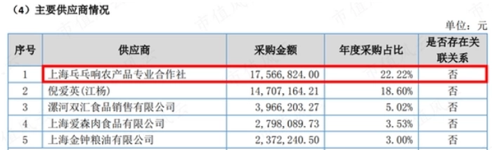2019年,更名为上海品铂农产品专业合作社的乓乓响合作社从前五大供应商中消失,但2020年又成为第二大供应商,采购总额占比为7.3%,但今年又宣布不与上海乓乓响农产品专业合作社合作。