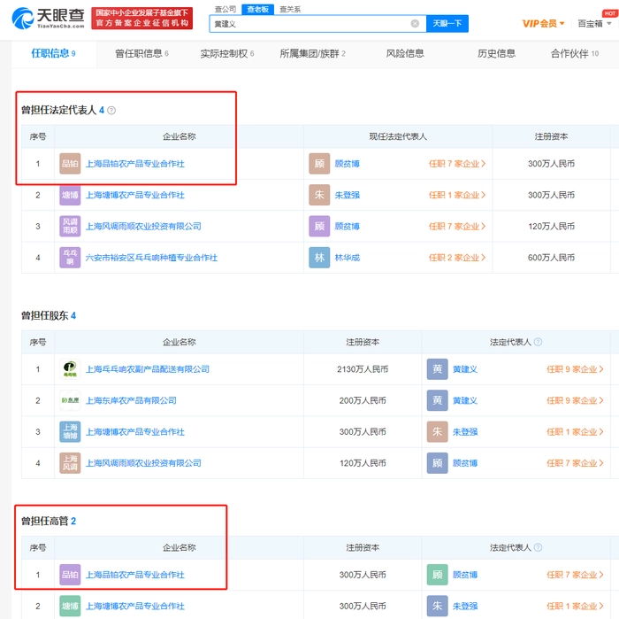 是不是关联方,我们不做判断,但通过天眼查可以发现乓乓响实控人黄建义曾是上海乓乓响农产品专业合作社(后更名为上海品铂农产品专业合作社)的法人并担任高管。2015年7月,黄建义将乓乓响农产品专业合作社75%股权转让给第三方。而2016年这家公司又成了乓乓响的关联方,说明黄建义仍然起到决定性的作用。