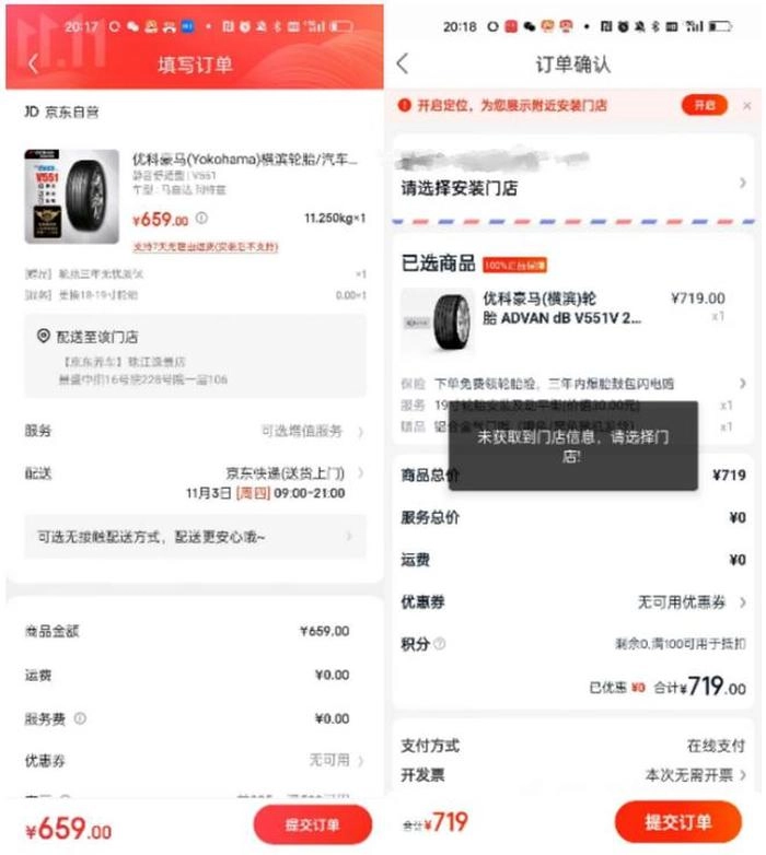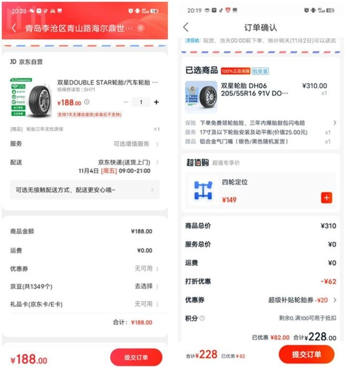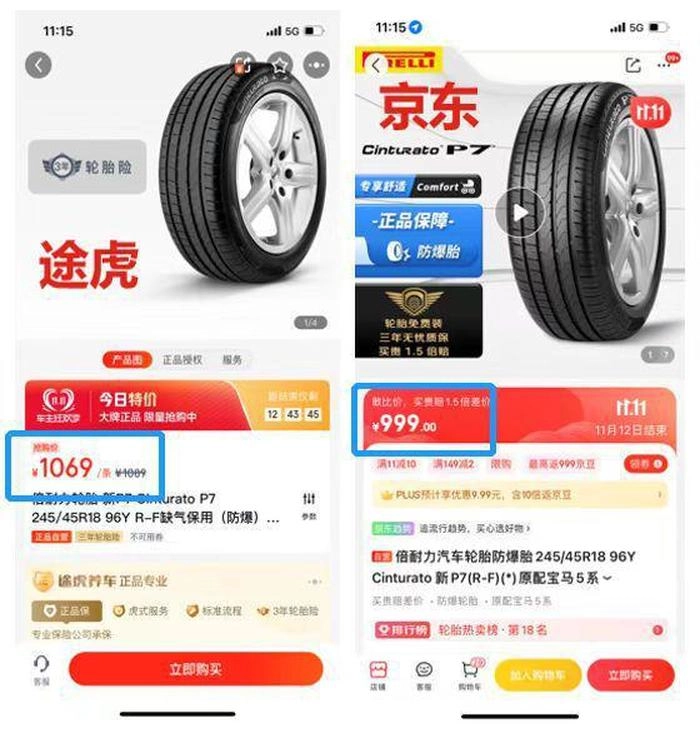 比如同样一款双星205/55R的轮胎在京东养车上卖188元,在途虎缺卖228元;同样一款优科豪马225/45R的轮胎,在京东养车卖659元,在途虎却卖719元……
