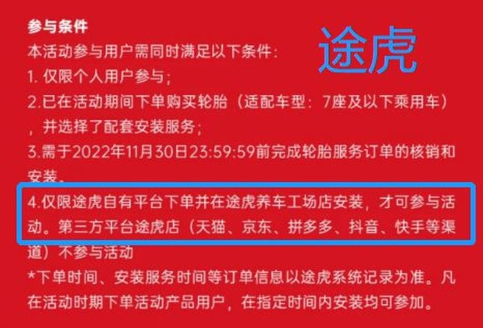 为了不掉坑里,老李还仔细看了两家的活动细节,发现跟京东养车把所有轮胎产品全部拿出来做活动不同,途虎养车只表明指定产品才参加,至于什么是指定产品并没有说明,而且在产品的销售页面也没有明确的符号指向这个活动。