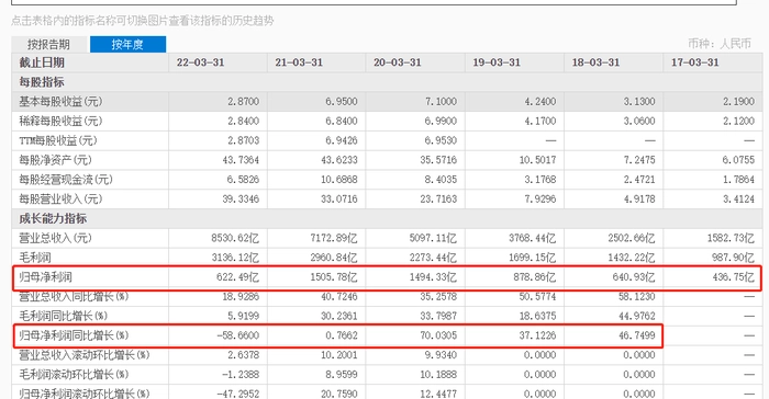 据财报显示,阿里在2022财年增收不增利,全财年(2021.4.31--2022.3.30)总营收8530.62亿元,同比增长19%,看似增长不错,但归母净利润却下滑了59%,622.49亿元的净利润相比上一财年的1505.78亿元减少了883.29亿元。而622.49亿元的归母净利润创下了近5年新低,近6年内也仅高于2017财年的436.75亿元,比2018财年的640.93亿元还低了18.44亿元,阿里辛苦五年,一朝回到五年前。