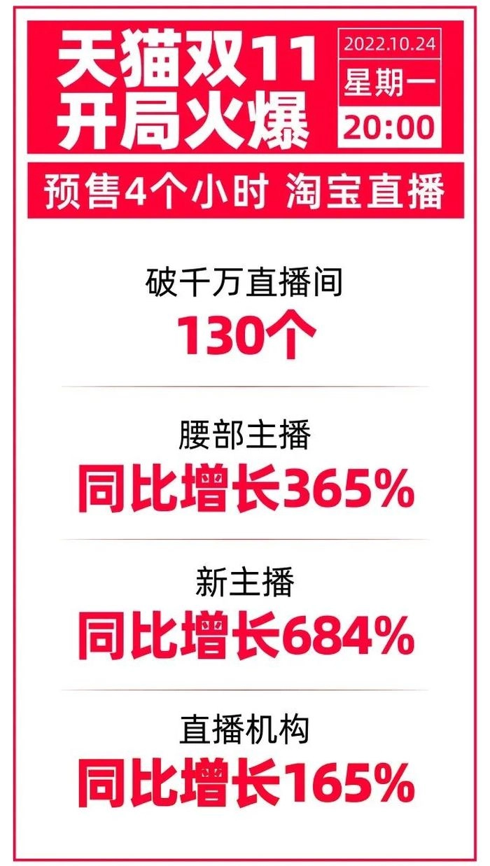 在天猫官方公布的数据中,10月24日20点-24点短短的4个小时里,天猫双十一预售直播活动即产生了130个预售金额破千万的直播间。