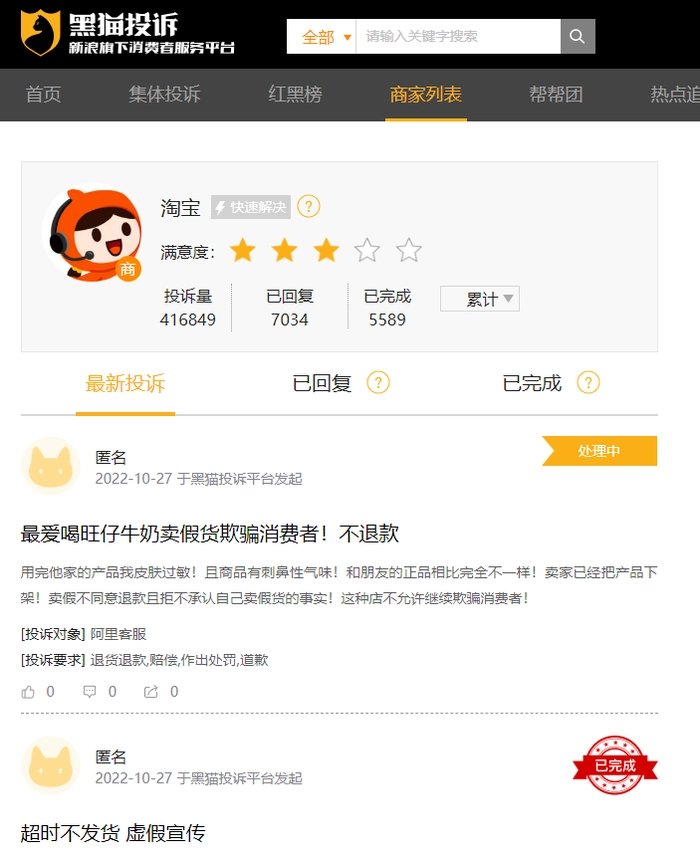 而部分消费者在直播中买到的产品远低于心理预期,就会产生对平台的不信任,导致平台的品牌影响力受损,也会出现数量庞大的消费维权事件,黑猫投诉平台显示,淘宝累计投诉量已近42万件。